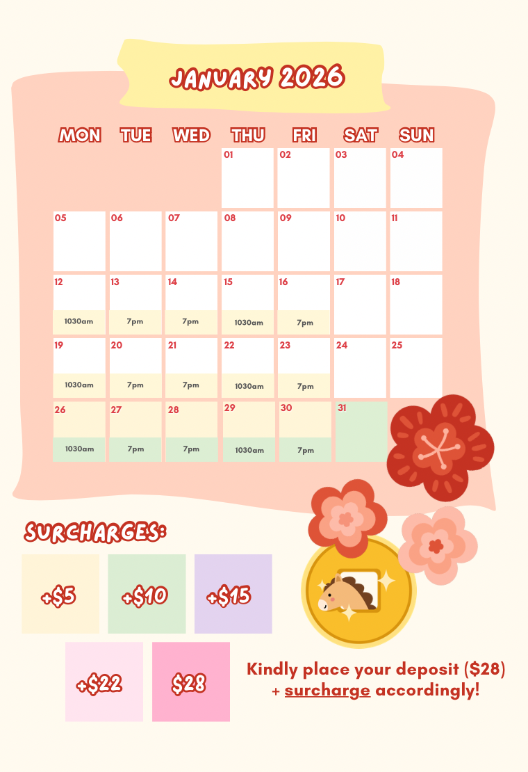 ReschedulingAny rescheduling should be made at least a week before your appointment date. *Additional surcharge might be incurred.